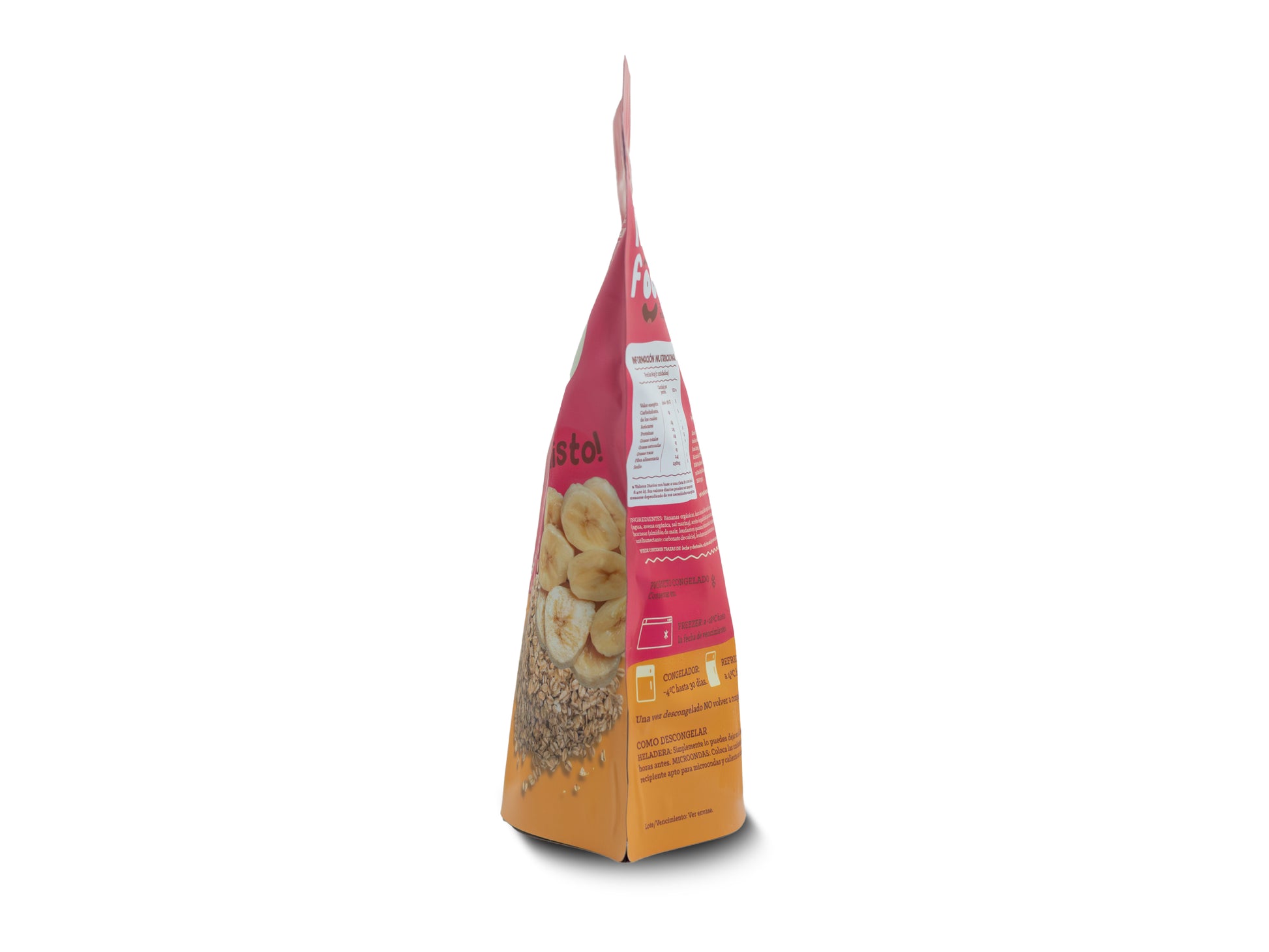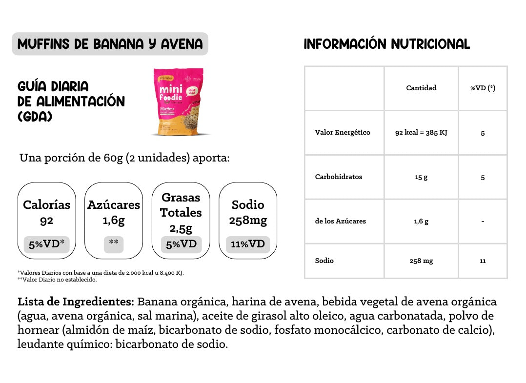 Banana orgánica, harina de avena, bebida vegetal de avena orgánica, aceite de girasol alto oleico, agua carbonatada, polvo de hornear, bicarbonato de sodio.